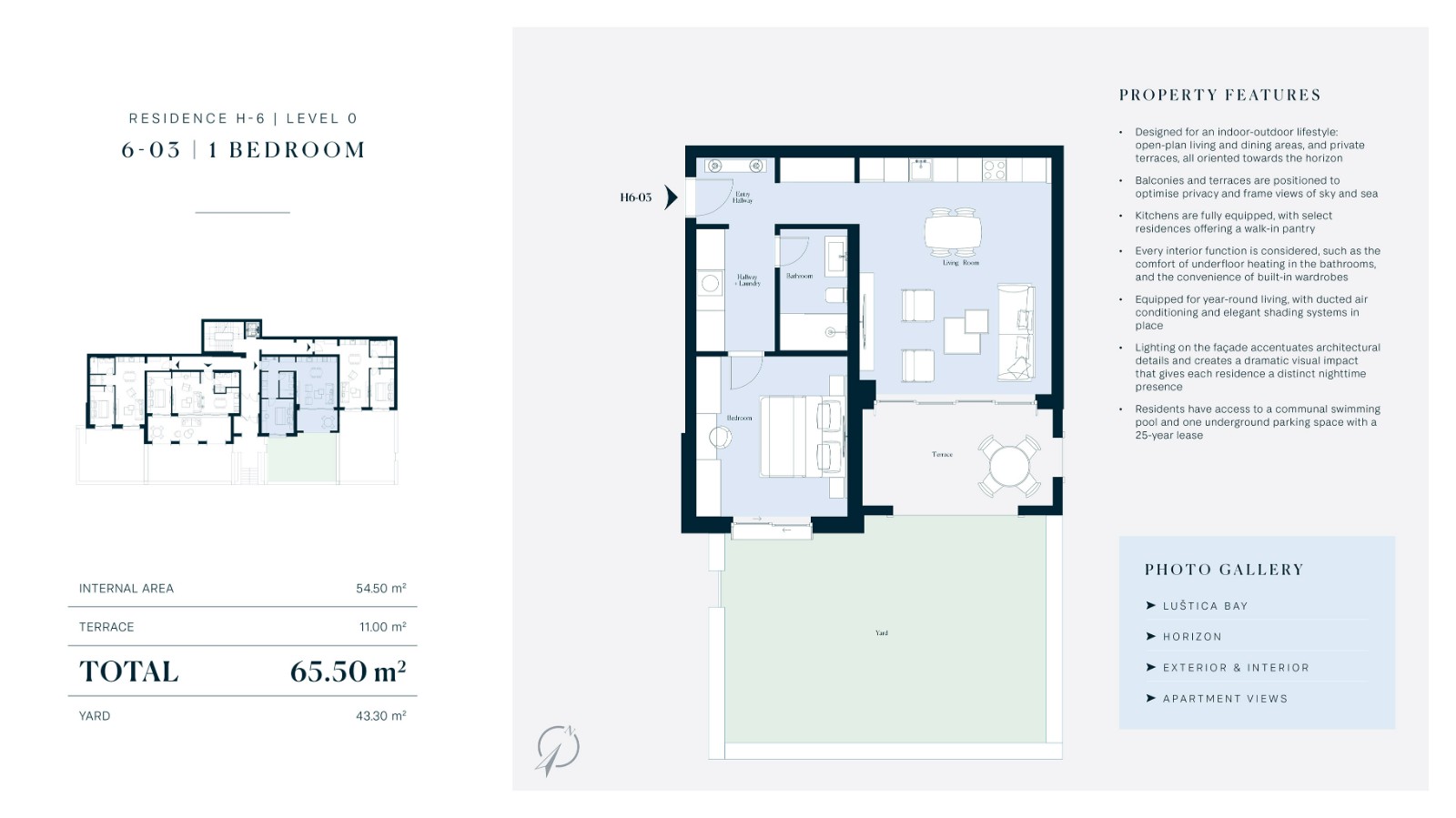 Светлые и функциональные интерьеры включают open-space зону гостиной и столовой, приватные террасы, полностью оборудованные кухни, тёплые полы в ванных комнатах и встроенные шкафы.